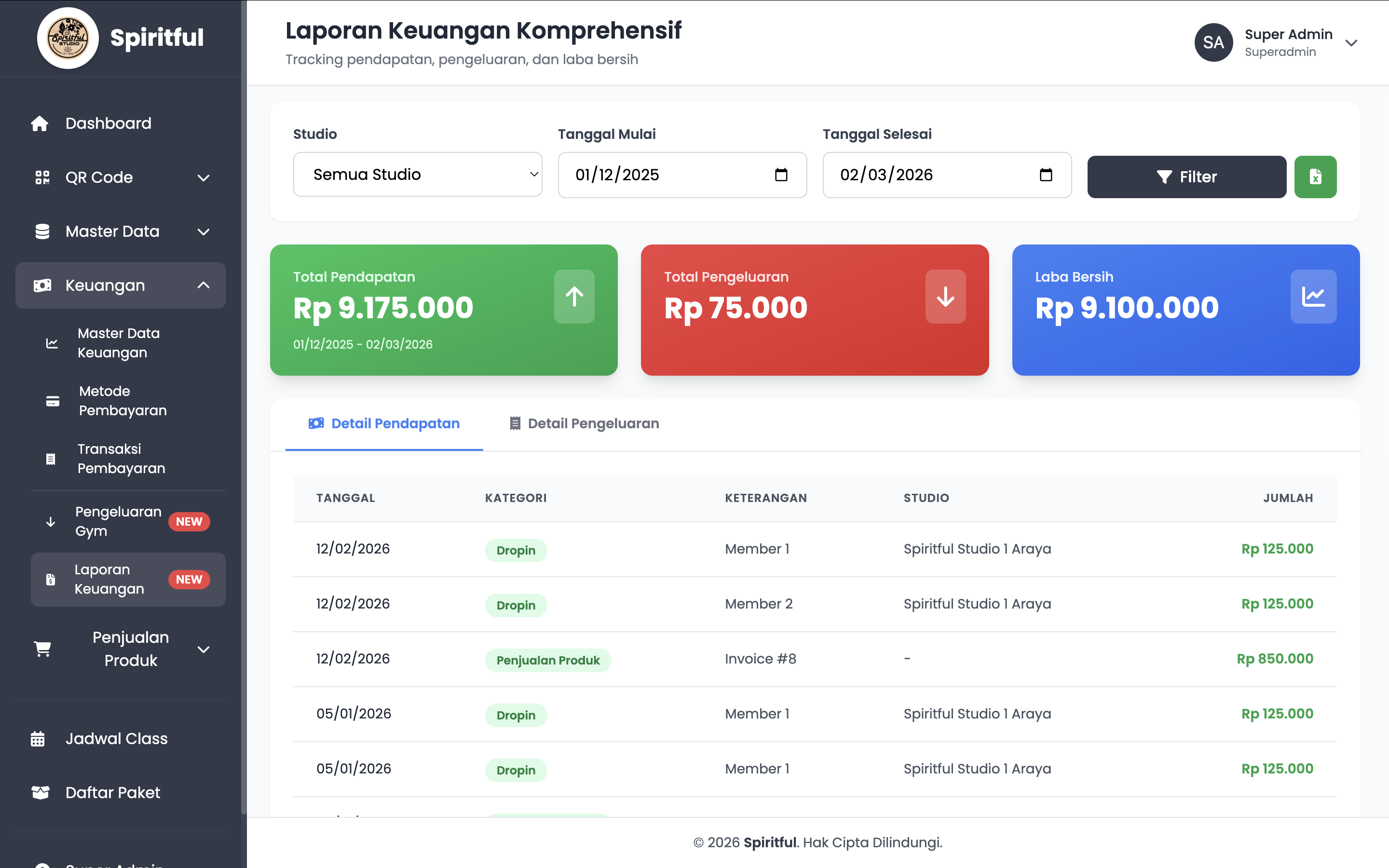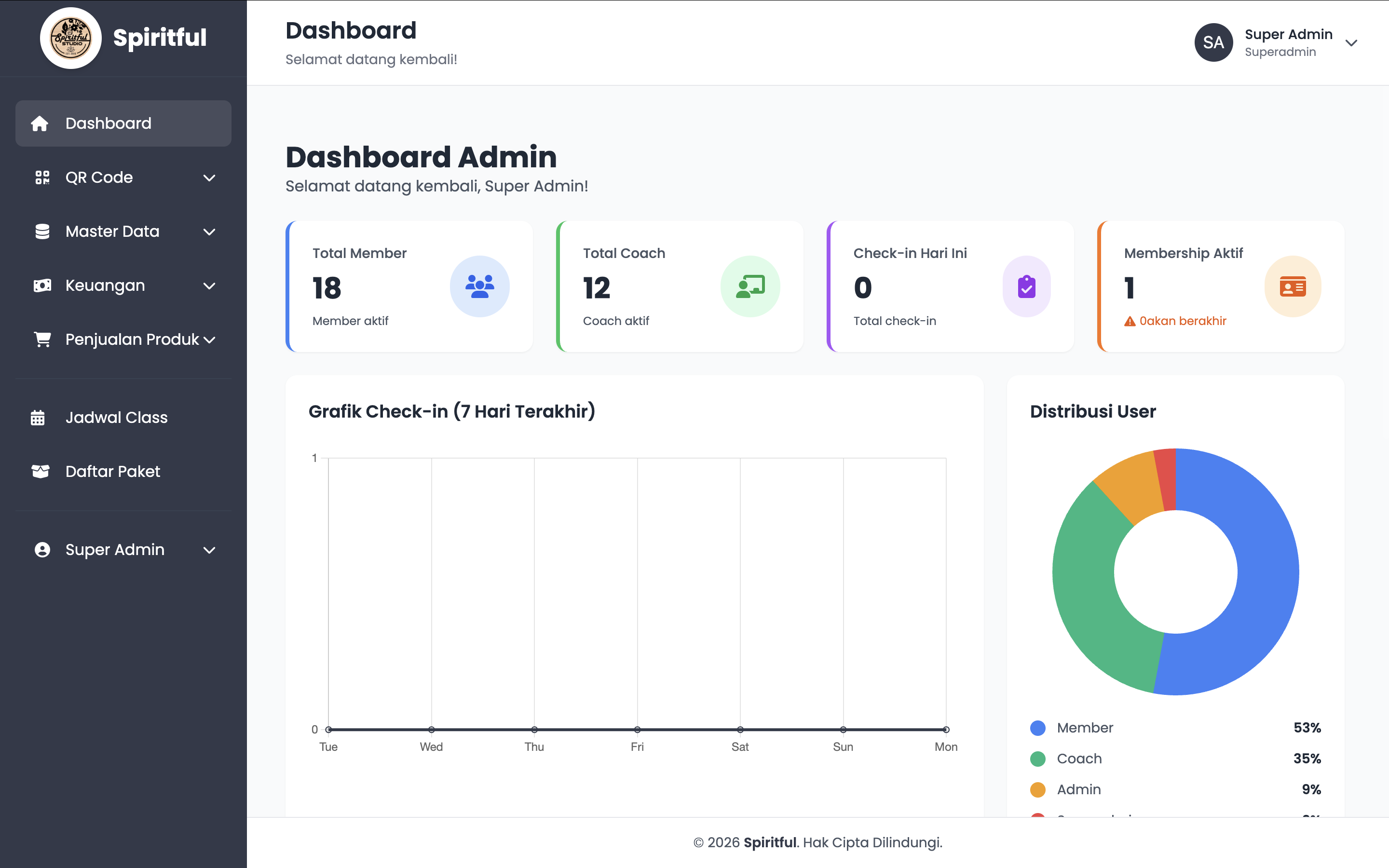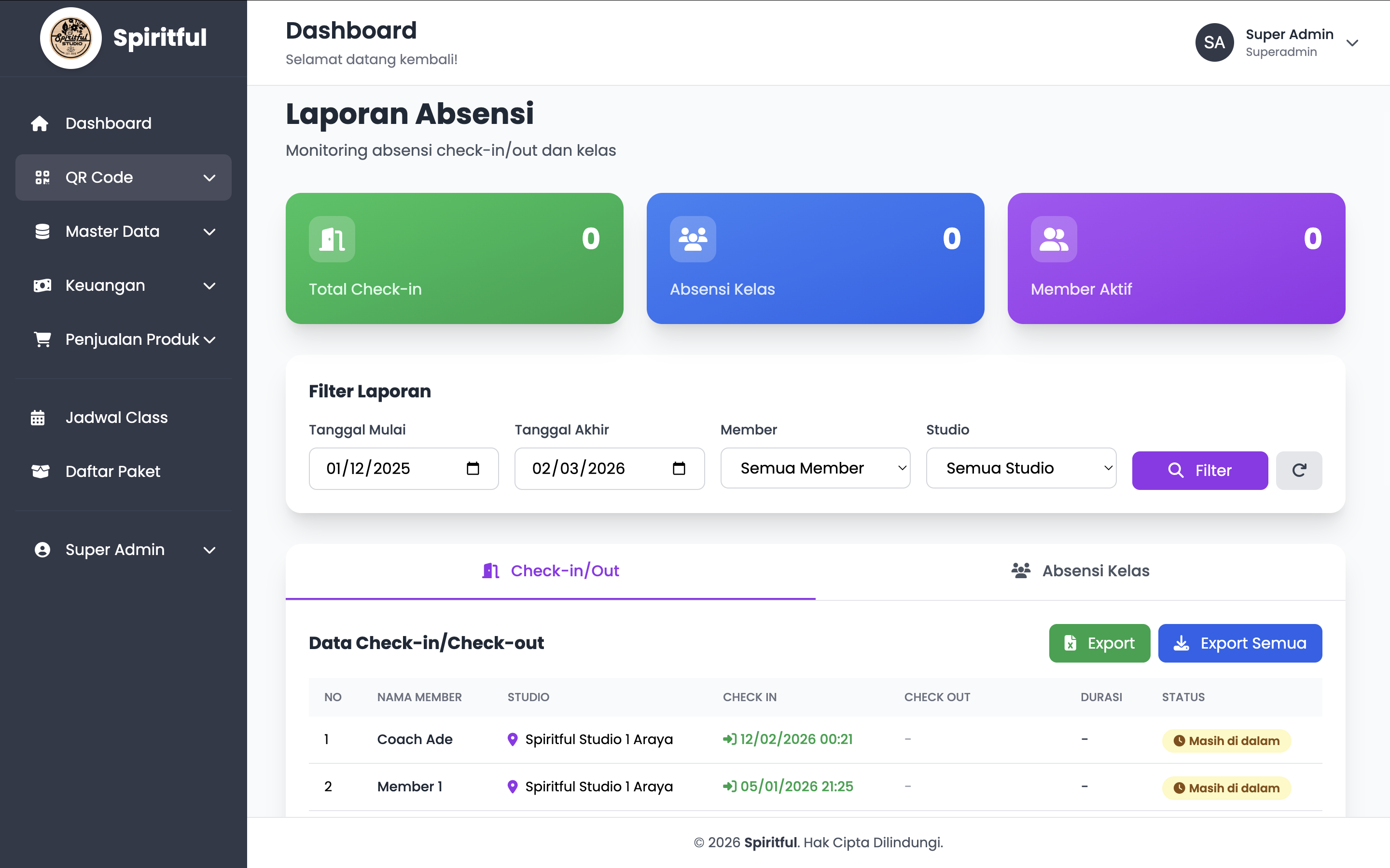 A full-featured system for managing memberships, class schedules, payments, QR/NFC attendance, and financial reporting — built with Laravel and Tailwind CSS for Spiritful Gym Studio.